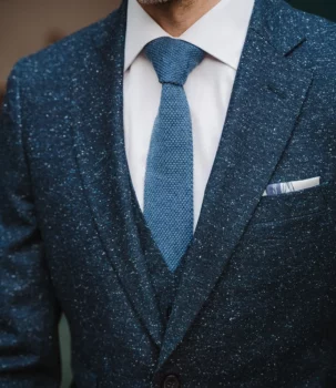 La cravate en maille contribue à faire d’Adrien, une silhouette facile à porter au quotidien.