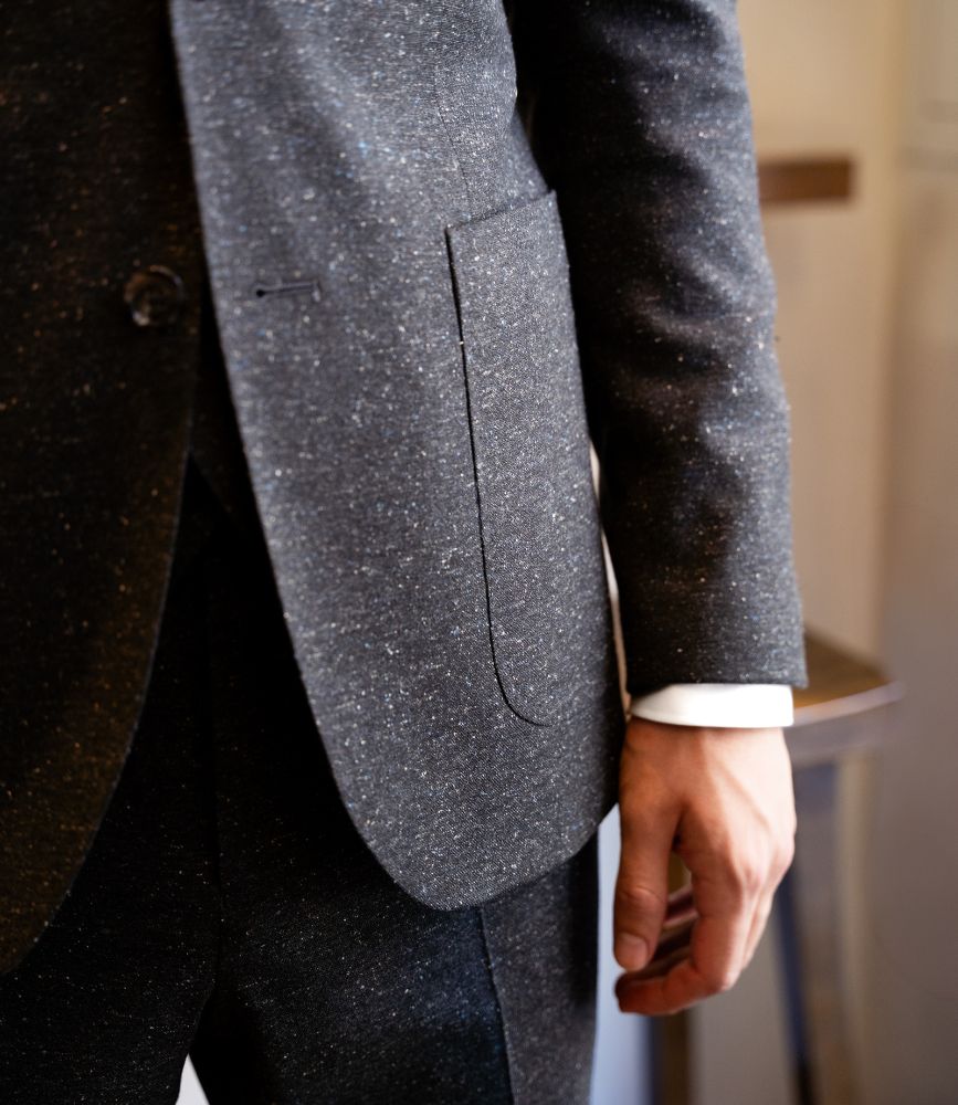 Elle est coupée dans un tweed léger anthracite en laine et soie, à la texture subtilement chinée. Le tissu révèle un effet de matière inédit avec ses doupions gris, bleus et blancs.