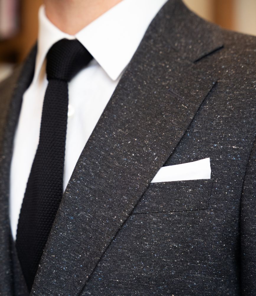 La sobriété de la chemise de popeline blanche et la cravate en maille noire renforce l’originalité discrète du tissu.
